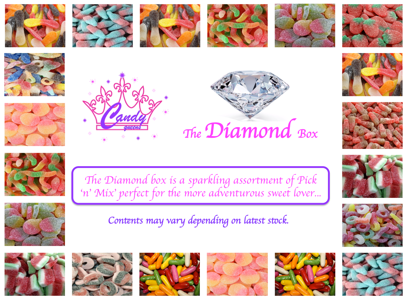 The Diamond selection is a sparkling assortment of Pick ‘n’ Mix’ perfect for the more adventurous sweet lover containing fizzy and sour sweets.
